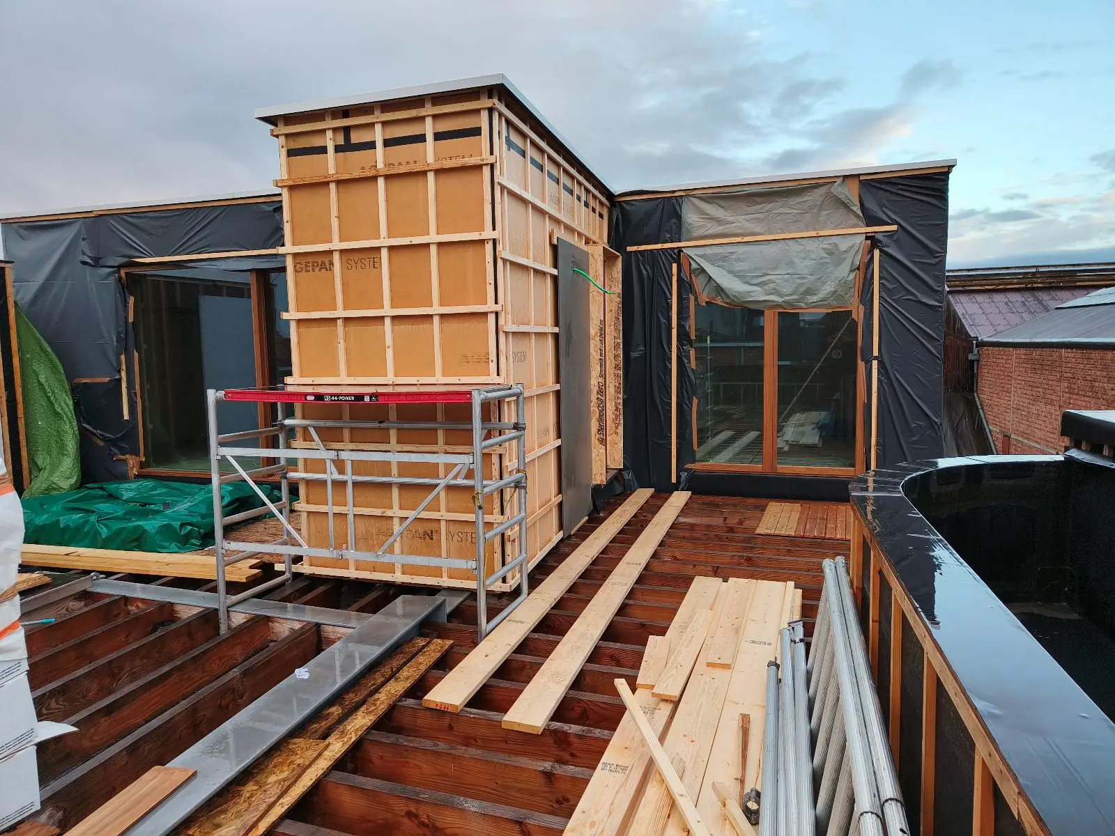 De constructie bestaat uit prefab vloer- en muurelementen, een zichtbare roostering en een dakopbouw met Rhinnox en ingeblazen cellulose, conform strikte brandeisen.