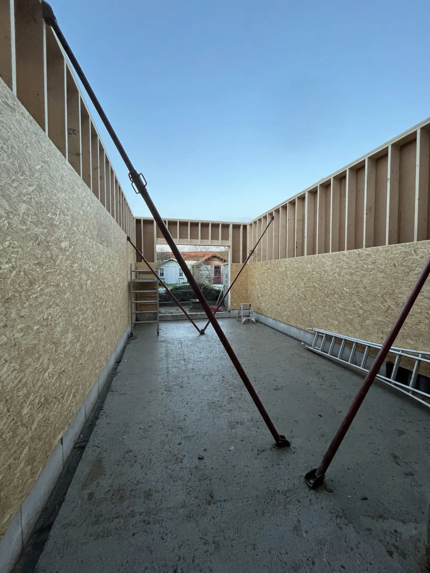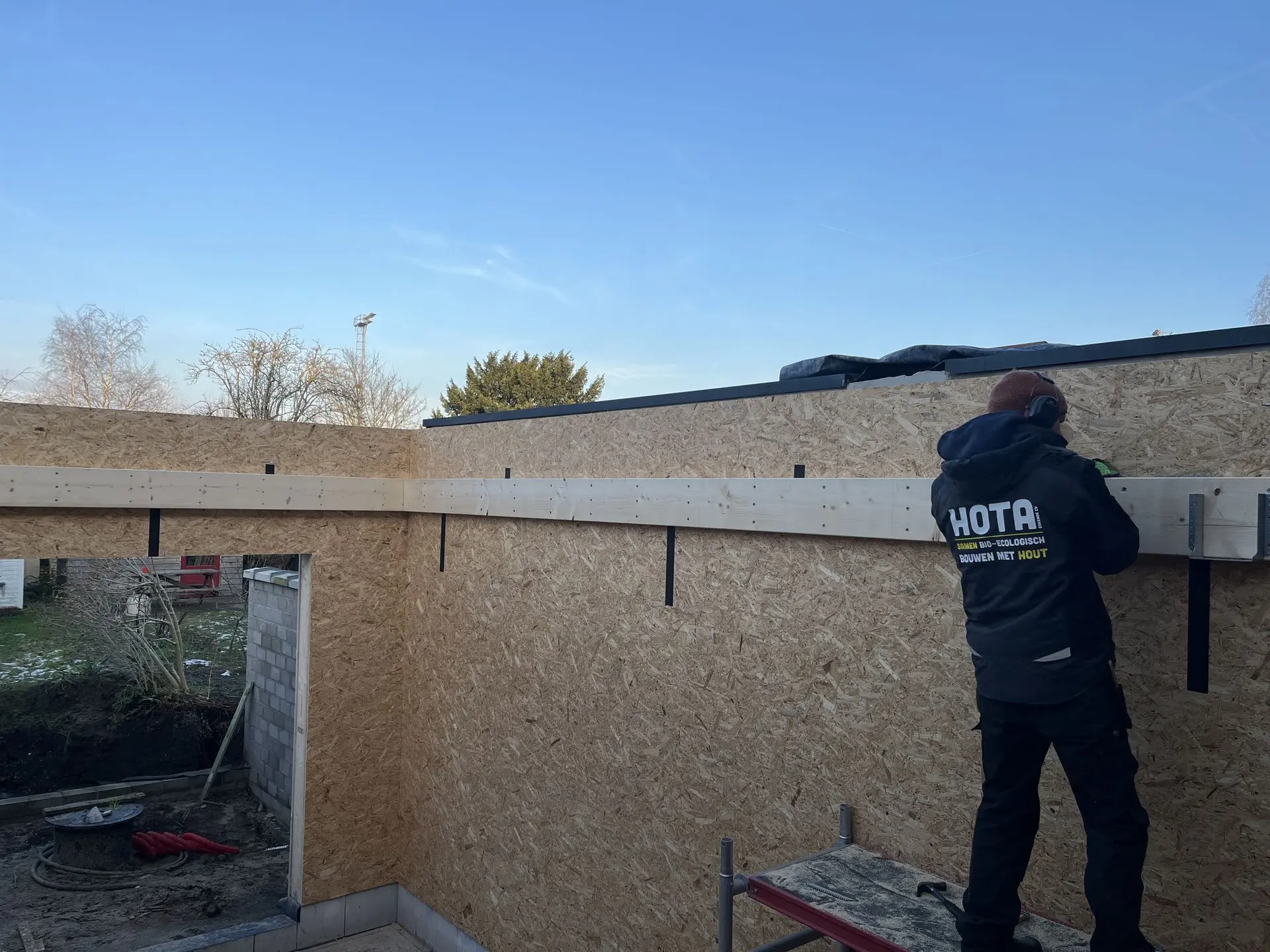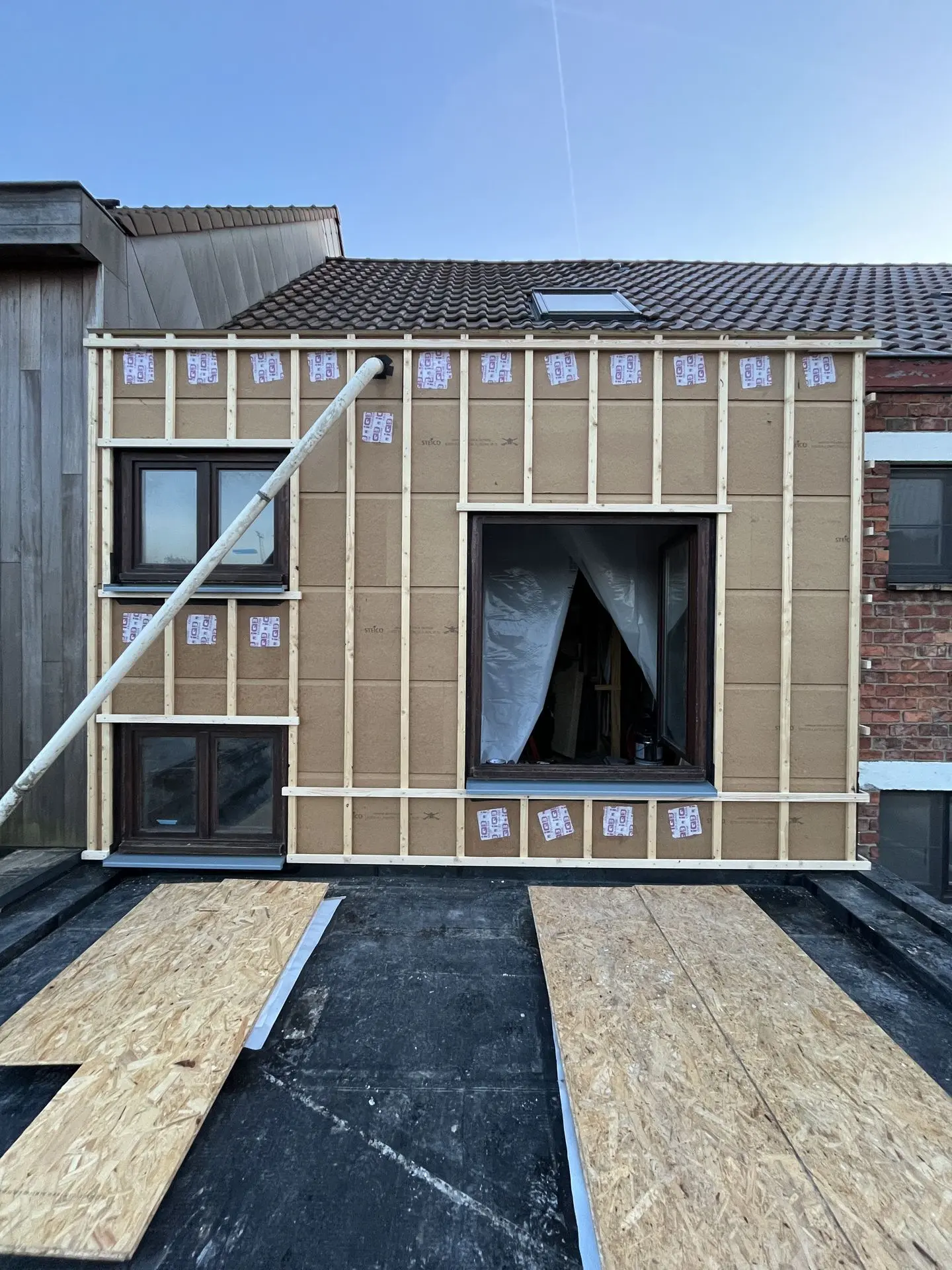 Hota realiseerde hier een elegante uitbreiding in houtskelet, inclusief een voorhanggevel in Douglas op de achtergevel. De isolatie gebeurde met Agepan platen en ingeblazen cellulose voor optimaal wooncomfort.